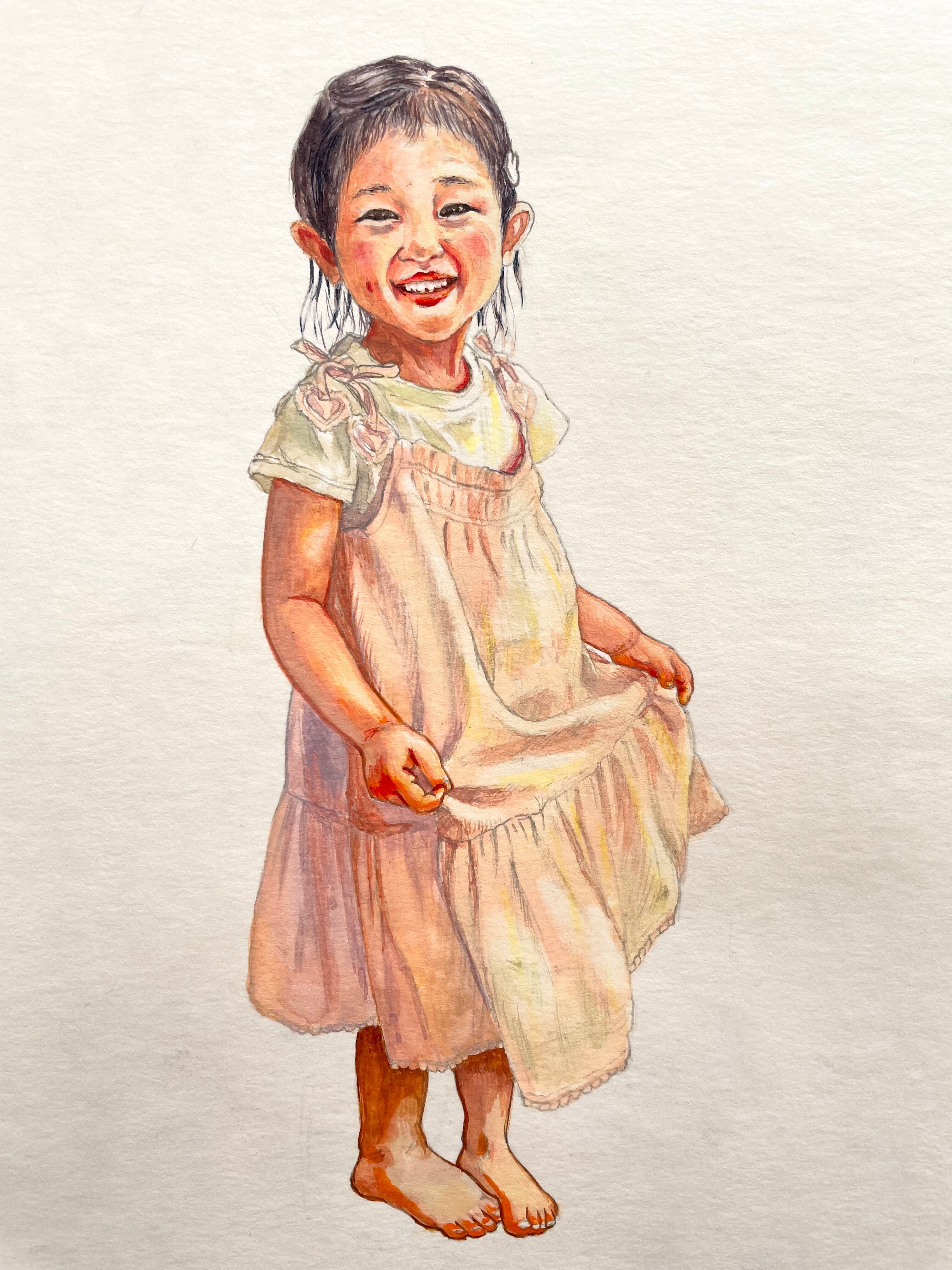 こちらはA4サイズでの、水彩紙に鉛筆・水彩絵具を使用した、カラーの人物画作品となります。