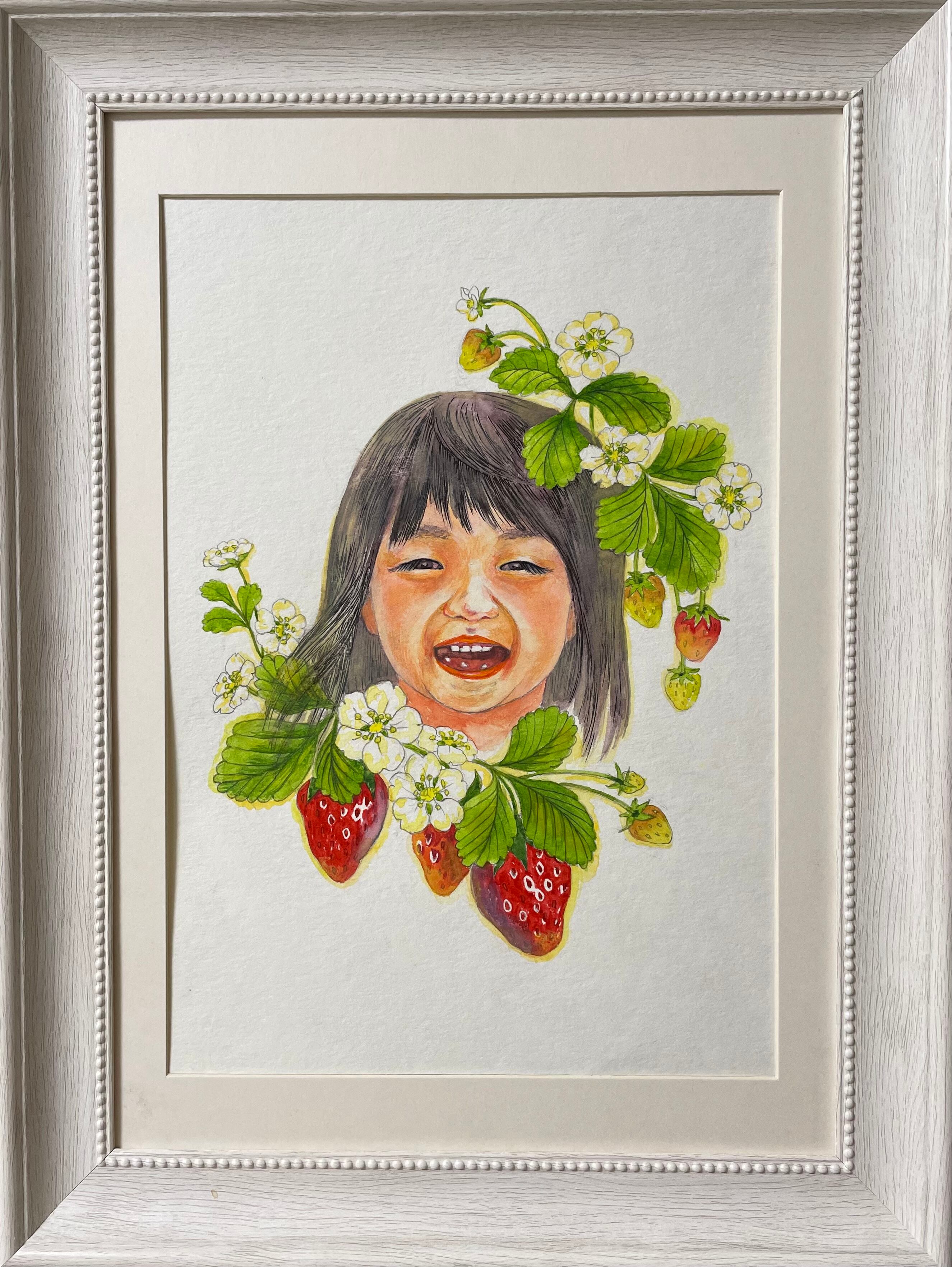 こちらはA4サイズでの、水彩紙に鉛筆・水彩絵具を使用した、カラーの人物画+植物画作品となります。